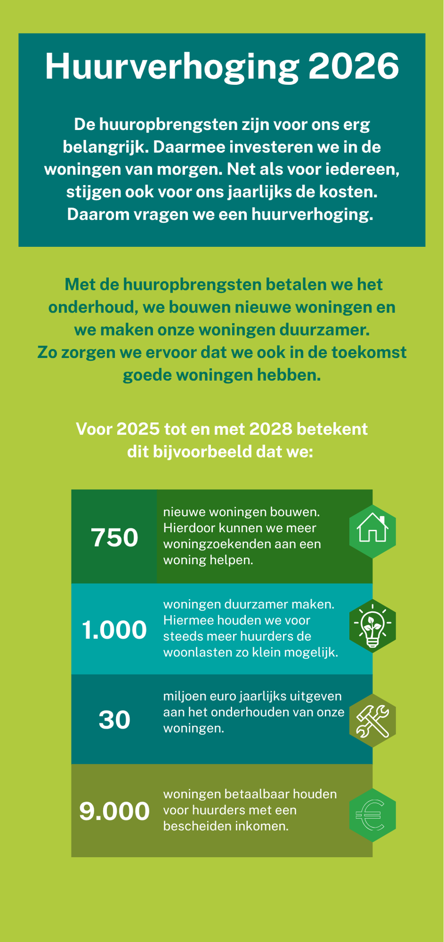 De huuropbrengsten zijn voor ons erg belangrijk. Daarmee investeren we in de woningen van morgen. Net als voor iedereen, stijgen ook voor ons jaarlijks de kosten. Daarom vragen we een huurverhoging.