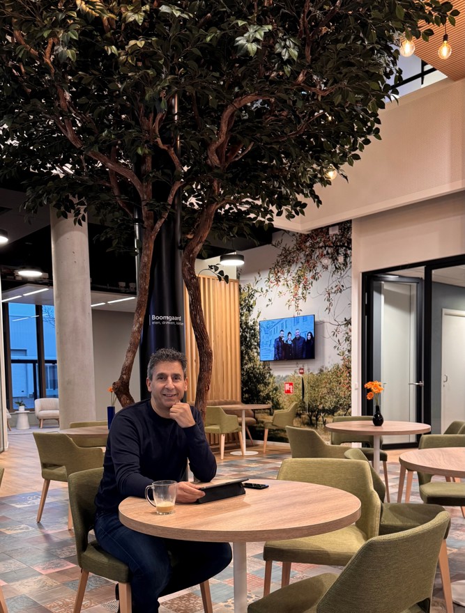 Het gebouw heeft verschillende werkruimtes met allemaal een eigen sfeer. Niemand heeft een eigen werkplek of kamer in het nieuwe kantoor. Ook Hassan als directeur-bestuurder niet. Hij werkt in het hele gebouw. De ‘Boomgaard’, zoals de centrale plek en kantine op de begane grond heet, is een van Hassans favoriete plekken. Het hart van het gebouw. De ronde vorm van de tafeltjes staan volgens hem voor gelijkwaardigheid en verbinding. Hier spreekt hij collega’s en overlegt hij informeel met partijen waarmee wij samenwerken. Vlak bij de boom die een belangrijke plek in het gebouw inneemt.