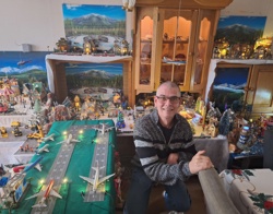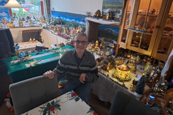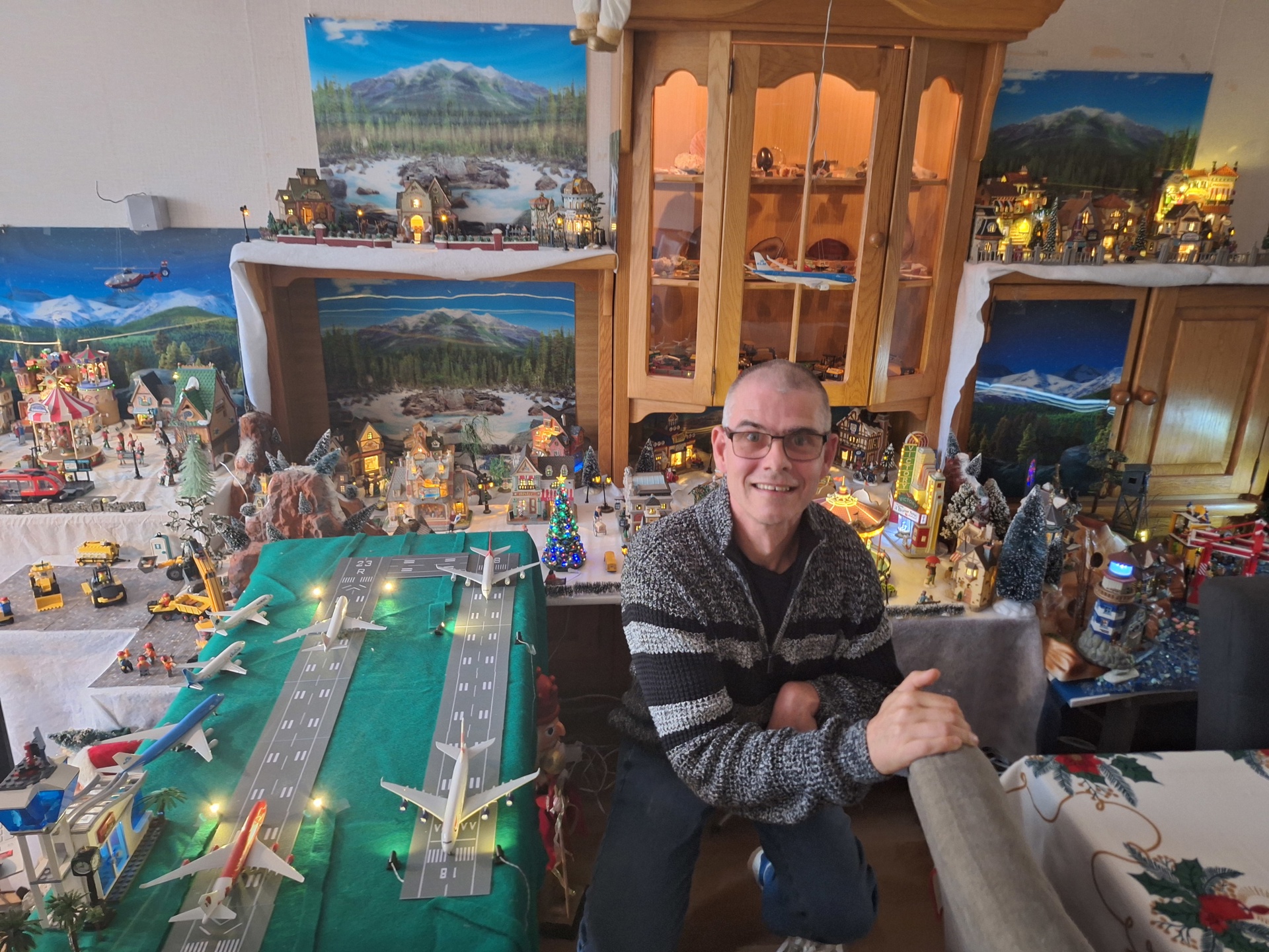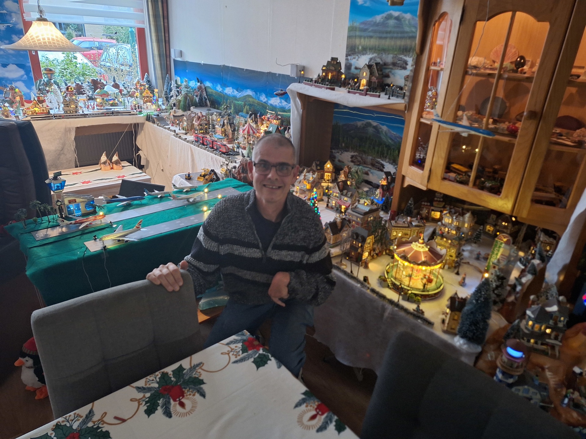 ‘Ik woonde in een klein appartement en moest elk jaar de kerstboom in de keuken zetten. Daar liep ik er steeds tegenaan. Mijn kerststal stond eronder op de grond, en daar schopte ik ook telkens tegenaan. Daarom begon ik met een klein kerstdorpje in een open kast. Dat was het begin van mijn hobby, die inmiddels behoorlijk uit de hand is gelopen nu ik meer ruimte heb in mijn woning aan de Molendijk. Nu heb ik 94 huisjes, vele attracties, en dit jaar onder andere een vliegveld, een trein en schepen die bezoekers naar het dorp brengen. Vorig jaar was dit gedeelte een skipiste. Zo wissel ik elk jaar af.’