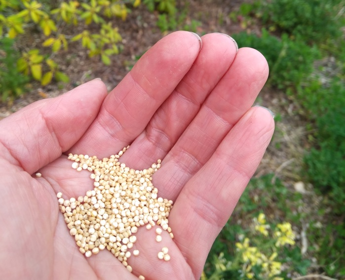 Daarnaast vind ik het vanwege de stijgende graanprijzen, een goed idee om dit jaar een heerlijke en gezonde graanvervanger in mijn voortuintje te zetten: quinoa. Ik had al gelezen dat de variant die je in de supermarkt kunt kopen weliswaar geschikt is om te zaaien, maar dat deze het niet goed doet in ons Nederlandse klimaat. Dus heb ik voor de zekerheid quinoa-zaad bij een biologische kweker gekocht en in mijn tuin uitgezaaid. Dit, op dezelfde manier als bij de kapucijners: een paar zaadjes in een kuiltje in de grond en de komende paar weken elke dag wat water geven, omdat het beginnende plantje nog geen (sterk) wortelstelsel heeft om zelf water dieper uit de grond te halen.