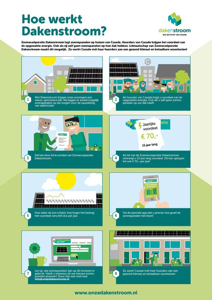 Zonnecoöperatie Dakenstroom legt zonnepanelen op huizen van Casade. Huurders van Casade krijgen het voordeel van de opgewekte energie. Hoe zit het precies met Dakenstroom?