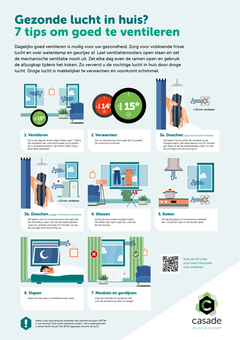 Goed ventileren in huis is belangrijk. Het zorgt voor frisse lucht, voorkomt vocht- en schimmelproblemen en draagt bij aan een gezonde leefomgeving. Toch is het niet voor iedereen vanzelfsprekend hoe dat het beste kan. Daarom ziet u op onze nieuwe flyer met duidelijke plaatjes waarom en hoe u goed kunt ventileren.