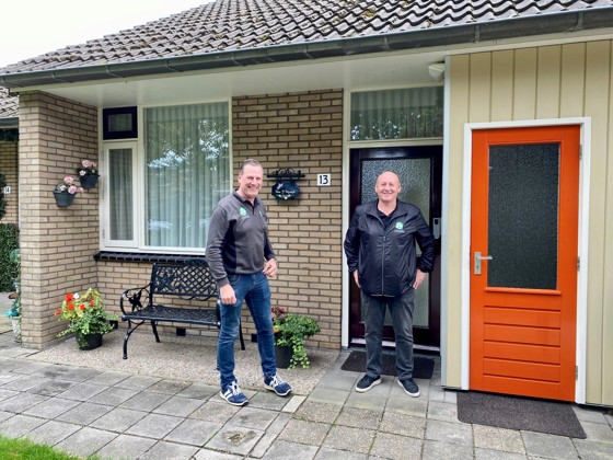 Adriaan en Tony voor het huis waar ze 30 jaar geleden aan gewerkt hebben
