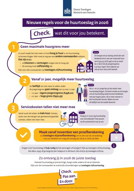 Er is geen huurgrens meer om huurtoeslag te kunnen krijgen. Dat betekent dat meer mensen huurtoeslag kunnen krijgen. Is uw huur in 2026 hoger dan de huurgrens (in 2026: € 932,93)? Dan heeft u misschien recht op huurtoeslag. Heeft u al huurtoeslag aangevraagd? Dat kan op toeslagen.nl. Ook kunt u daar een proefberekening maken.