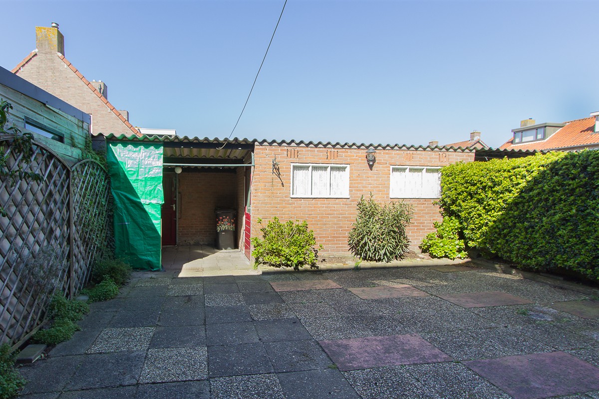De omsloten achtertuin met terras is onderhoudsvriendelijk ingedeeld. Tegen de stenen berging is een overkapping gecreëerd met een poort naar de brandgang.