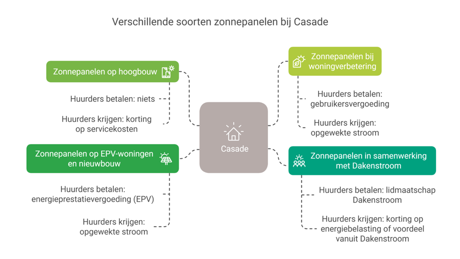 - Zonnepanelen in samenwerking met Dakenstroom – Zonnecoöperatie Dakenstroom legt zonnepanelen op sommige huizen van Casade. Huurders van Casade kunnen lid worden van deze coöperatie en krijgen dan het voordeel van de opgewekte energie. Ook als zij zelf geen zonnepanelen op hun dak hebben. Zo werkt Casade mét haar huurders aan een gezond klimaat en betaalbare woonlasten. Zie ook infographic-hoe-werkt-dakenstroom.pdf of de website van Dakenstroom.