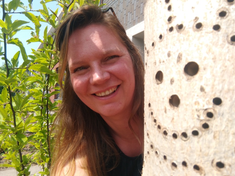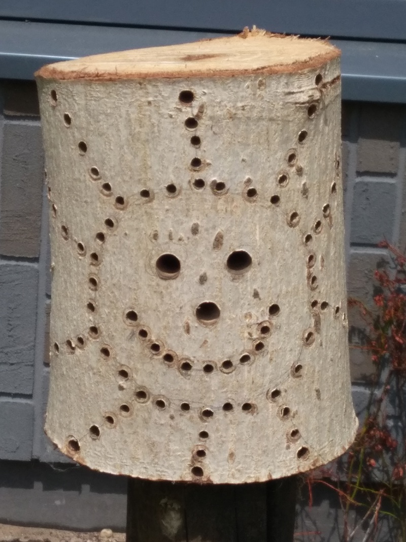 En, omdat deze diertjes het in ons overbevolkte landje al lastig genoeg hebben, heb ik een paar maanden geleden in mijn achtertuin al een kant-en-klaar insectenhotel opgehangen. En daar zijn inmiddels al vele kamers volgeboekt! Daarom werd het tijd voor een extra hotel. Maar dan één die ik zelf zou maken. Met een stammetje hout en een boor in de hand ging ik aan de slag met een ludieke ‘boorgattekening’. Namelijk: een vrolijke zon die je stralend tegemoet lacht. Letterlijk. Ik word blij van zo’n zonnesmiley midden in mijn tuin, en volgens mij de bijen ook. Ik denk zelfs dat die stiekem gewoon vrolijk teruglachen…